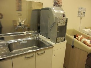 ミルク作り用の熱湯、オムツ替えシートも設置されています。